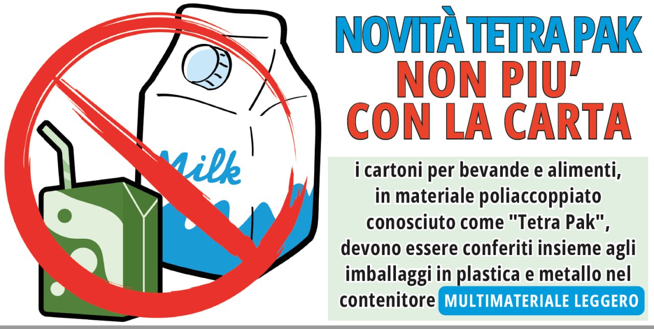 A partire dal mese di aprile 2025, i cartoni per bevande e alimenti (realizzati in materiale poliaccoppiato, conosciuto come "Tetra Pak") verranno raccolti assieme agli imballaggi in plastica e metallo, da conferire nel contenitore MULTIMATERIALE LEGGERO.