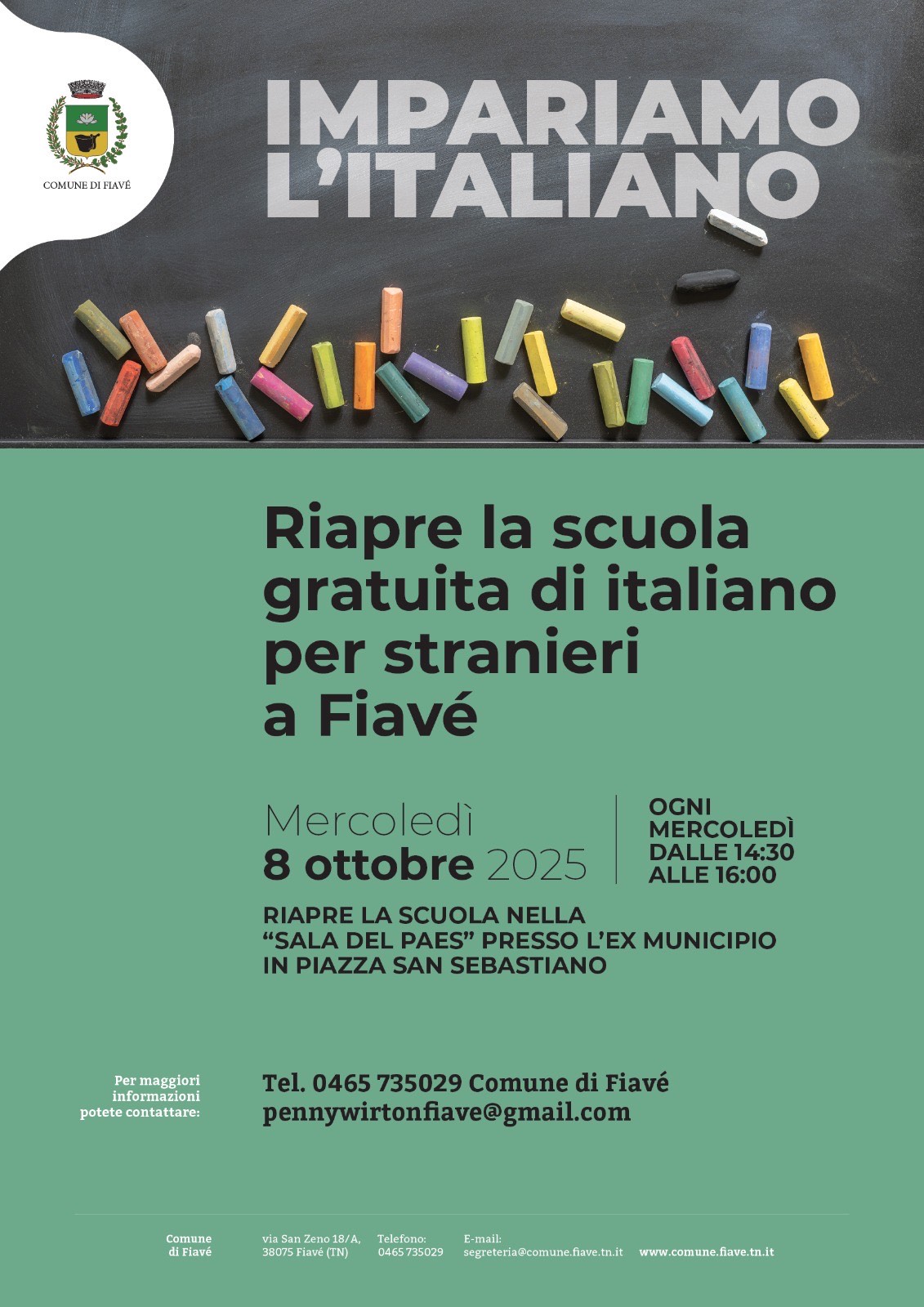 Descrizione Riapre la scuola di italiano per stranieri nella "Sala del Paes", ex Municipio Piazza San Sebastiano ogni mercoledì dalle ore 14:30 alle ore 16:00