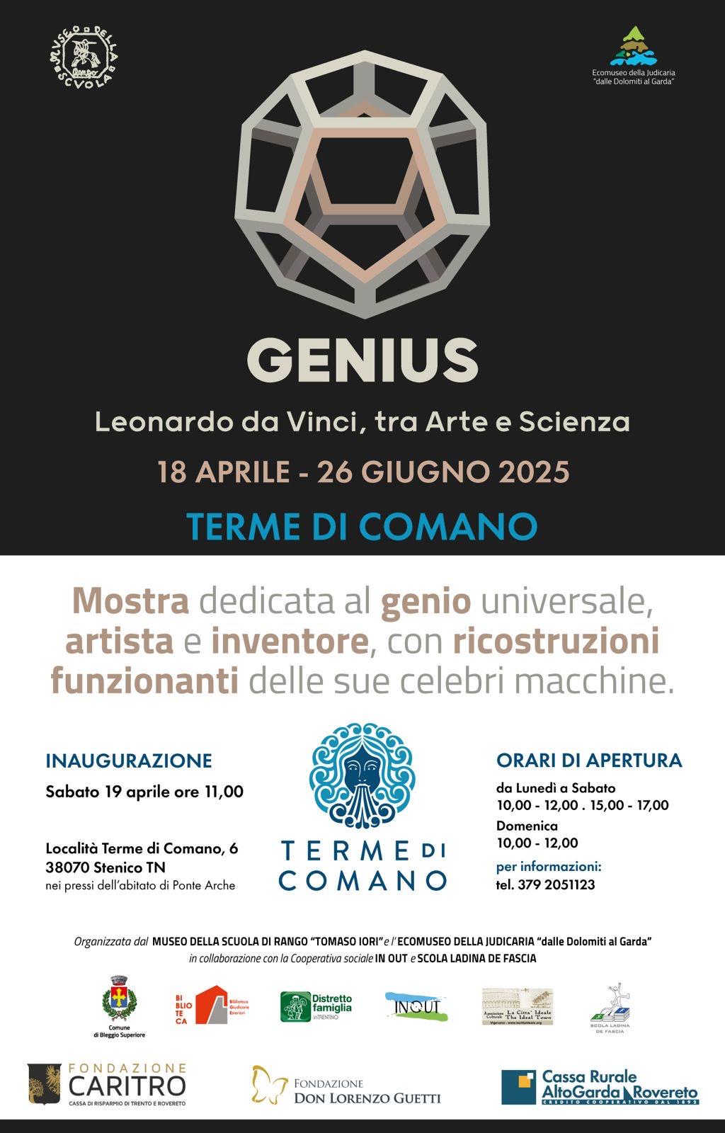 Mostra intitolata "Genius - Leonardo da Vinci, tra Arte e Scienza", organizzata presso le Terme di Comano dalle associazioni "Museo della Scuola di Rango Tomaso Iori" ed "Ecomuseo della Judicaria dalle Dolomiti al Garda", in collaborazione con la cooperativa sociale "In Out e Scola Ladina de Fascia".La mostra è dedicata al genio universale, artista e inventore, con ricostruzioni funzionanti delle sue celebri macchine.Tale iniziativa culturale è proposta fino al 26 giugno 2025 in loc. Terme di Comano n. 6 - 38070 Stenico (TN), con ingresso libero, con i seguenti orari di apertura:- da lunedì a sabato: dalle 10:00 alle 12:00 e dalle 15:00 alle 17:00- domenica: dalle 10:00 alle 12:00Per informazioni: telefono 379 2051123