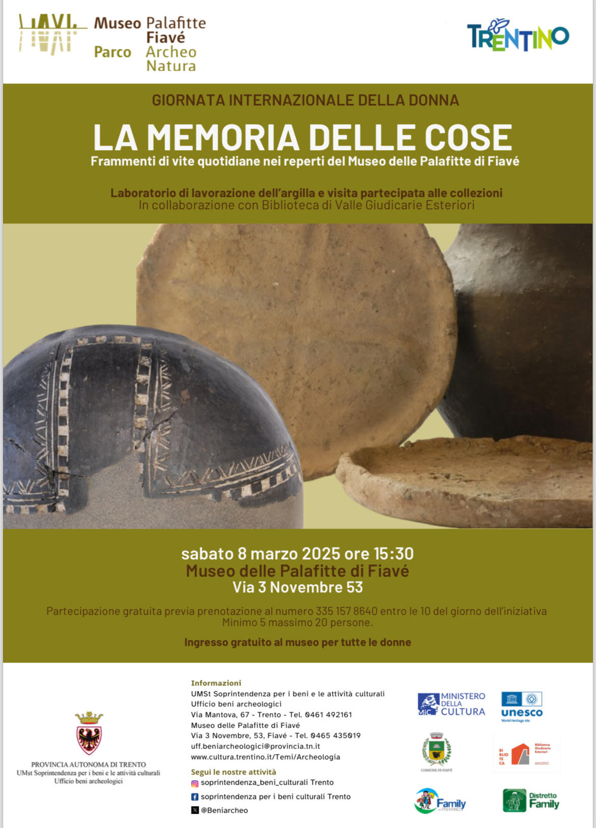 Giornata internazionale delle donna: Museo delle Palafitte di Fiavè sabato 08 marzo 2025 ore 15.30 laboratorio di lavorazione dell'argilla e visita partecipata alle collezioni