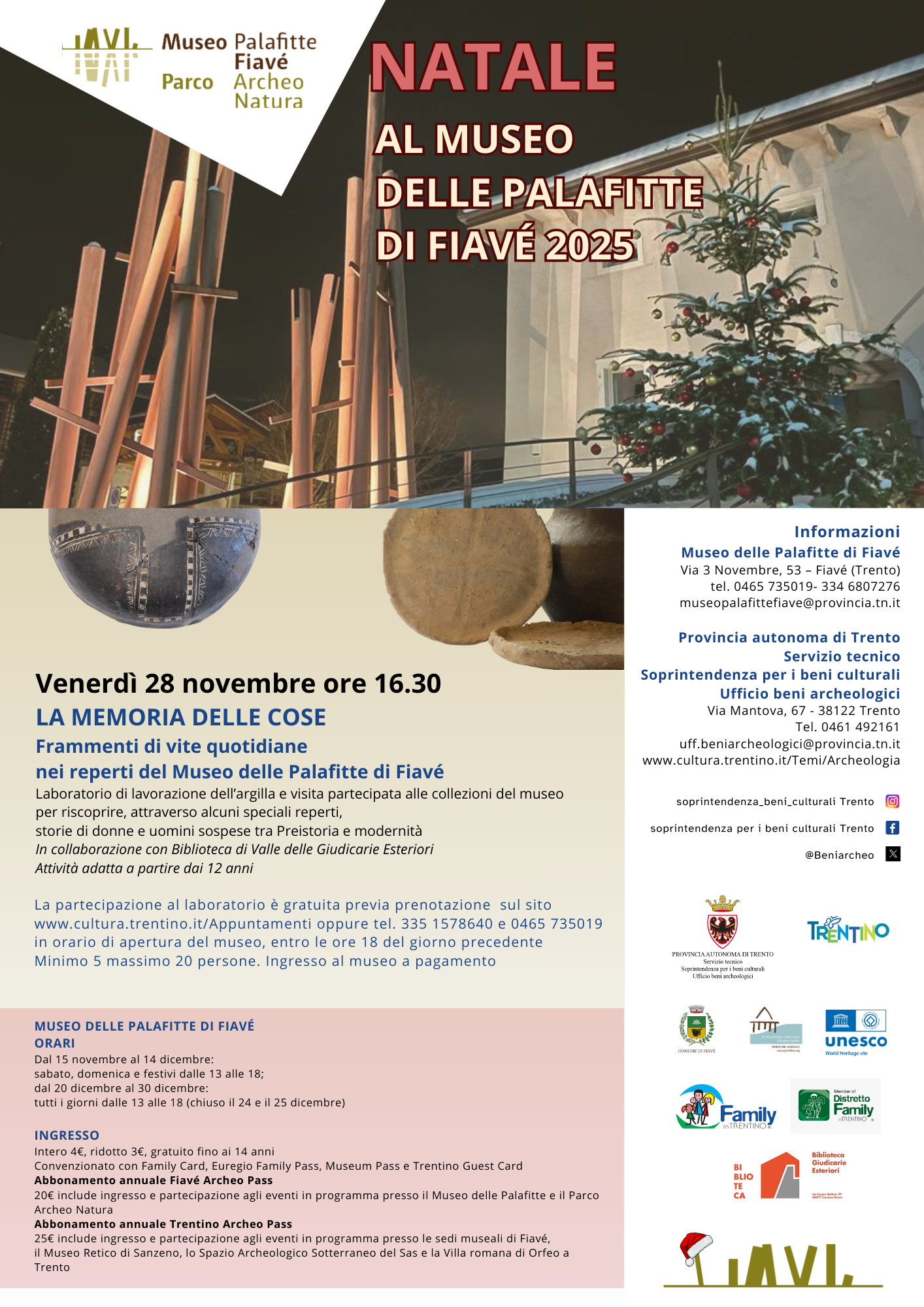Laboratorio realizzato in collaborazione con la Biblioteca di Valle delle Giudicarie Esteriori di lavorazione della creta abbinato a una visita partecipata alle collezioni del museo per scoprire, attraverso alcuni significativi reperti, frammenti di storie di donne e uomini sospese tra preistoria e modernità.