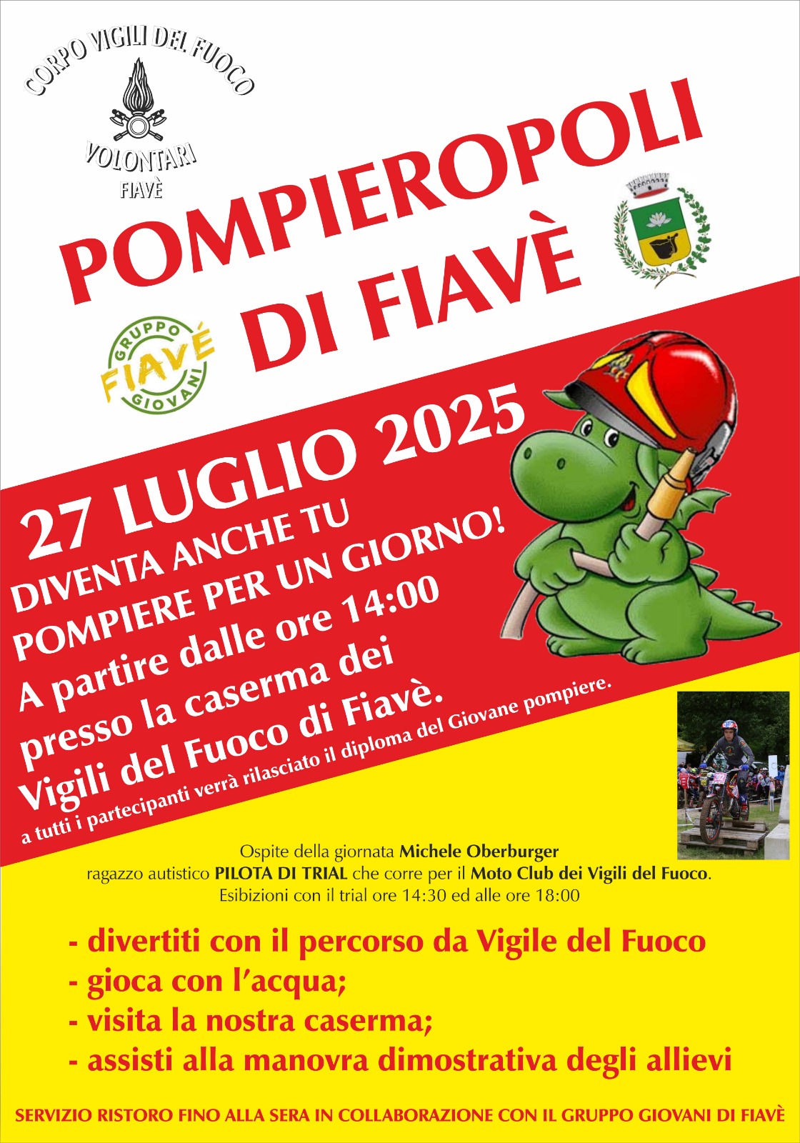 A partire dalle ore 14.00 presso la caserma dei Vigili del Fuoco Volontari di Fiavè giochi d'acqua, percorso del Vigile del Fuoco, visita della caserma, manovra dimostrativa degli allievi, esibizioni con il trail alle ore 14.30 e alle ore 18.00 di Michele Oberburger, ragazzo autistico pilota di trail che corre per Moto Club dei Vigili del Fuoco