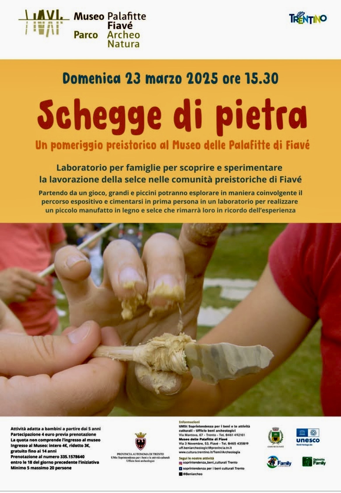 Partendo da un gioco, grandi e piccini potranno esplorare in maniera coinvolgente il percorso espositivo e cimentarsi in prima persona in un laboratorio per realizzare un piccolo manufatto in legno e selce che rimarrà loro in ricordo dell'esperienza.